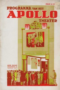 * Voorop een fraaie art-decotekening van Hans Borrebach. De film ‘Say it with Songs’ (‘Laat liederen uw tolk zijn’, 1929) bevat enkele bekende liedjes van Al Jolson, onder andere ‘Little Pal’. In het pand van het Apollo Theater, Spuistraat 19-21, was in de laatste decennia van de twintigste eeuw (tot 2013) de roemruchte Haagse afdeling van Antiquariaat De Slegte gevestigd. De vroege programma’s van deze bioscoop zijn zeldzaam.
