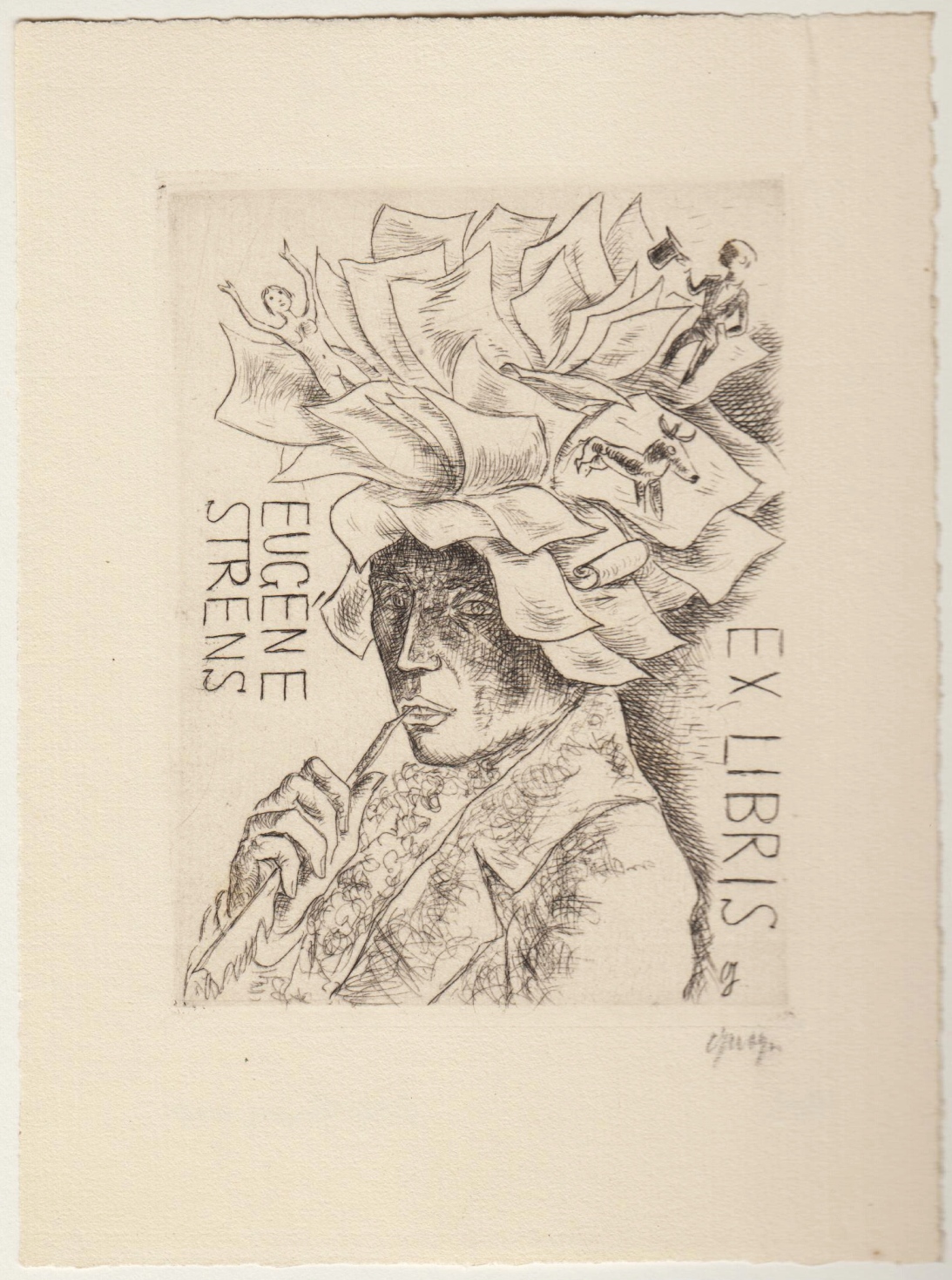 * Met indrukwekkend exlibris voor Eugène Strens uitgevoerd door Willi Geiger (1878-1971) in droge naald, gesigneerd in potlood: portret van een man aan wiens brein bladen met tekeningen ontspringen. Jaarwisselingsgeschenk van Drukkerij Meijer. Niet in de handel.