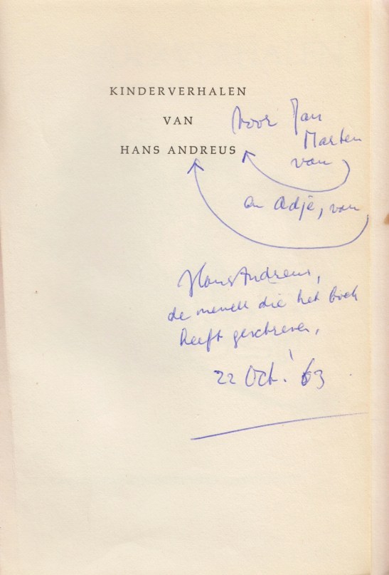 ¶ Opdracht van de auteur in balpen op de Franse titel: ‘voor Jan/ Marten/ van [HANS ANDREUS]/ en Adje, van [HANS ANDREUS]/ Hans Andreus,/ de meneer die het boek/ heeft geschreven./ 22. Oct. ’63’.