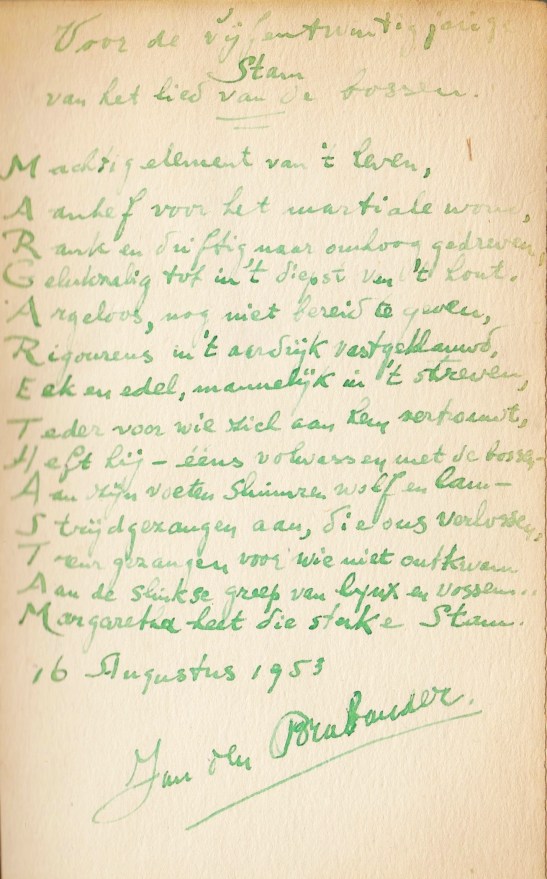 ¶ Opdracht van de auteur in zwarte inkt op het voorste schutblad: ‘Aan C.S. Adama/ van Scheltema/ van/ Margot Vos/ 7-11-23’.