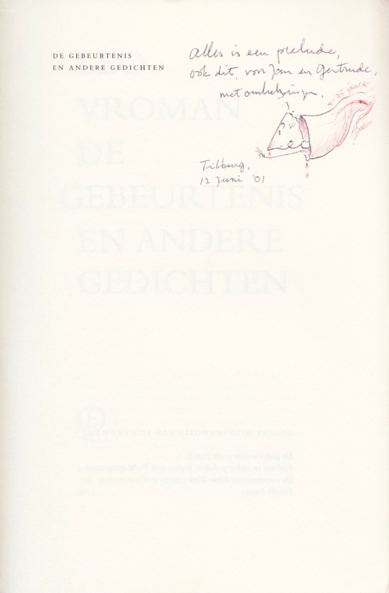Op pagina 40 van dit boek staat het gedicht ‘Een vat vol woorden’, door de auteur in handschrift opgedragen ‘Voor Gerard’, met in de laatste strofe een verwijzing naar Gerard van het Reve.