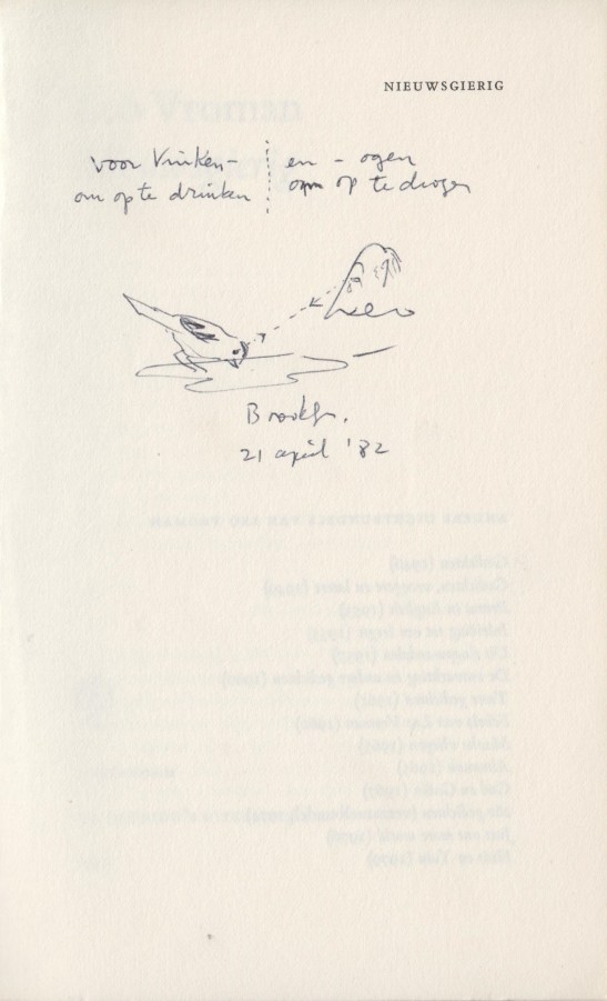 ¶ Opdracht van de auteur [aan Simon Vinkenoog] in balpen op de Franse titel: ‘voor Vinken-/ om op te drinken ⁞ en -ogen/ om op te drogen/ Leo/ Brooklyn,/ 21 april ’82’. Bovendien illustreerde de auteur zijn poëtische opdracht met een vink in een plas water en een zelfportretje met natte ogen. De handtekening ‘Leo’ is ook het portret.