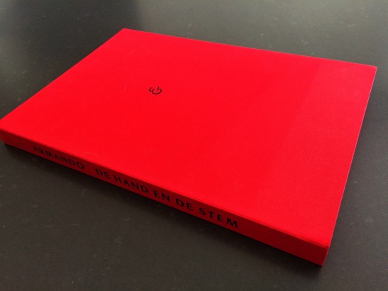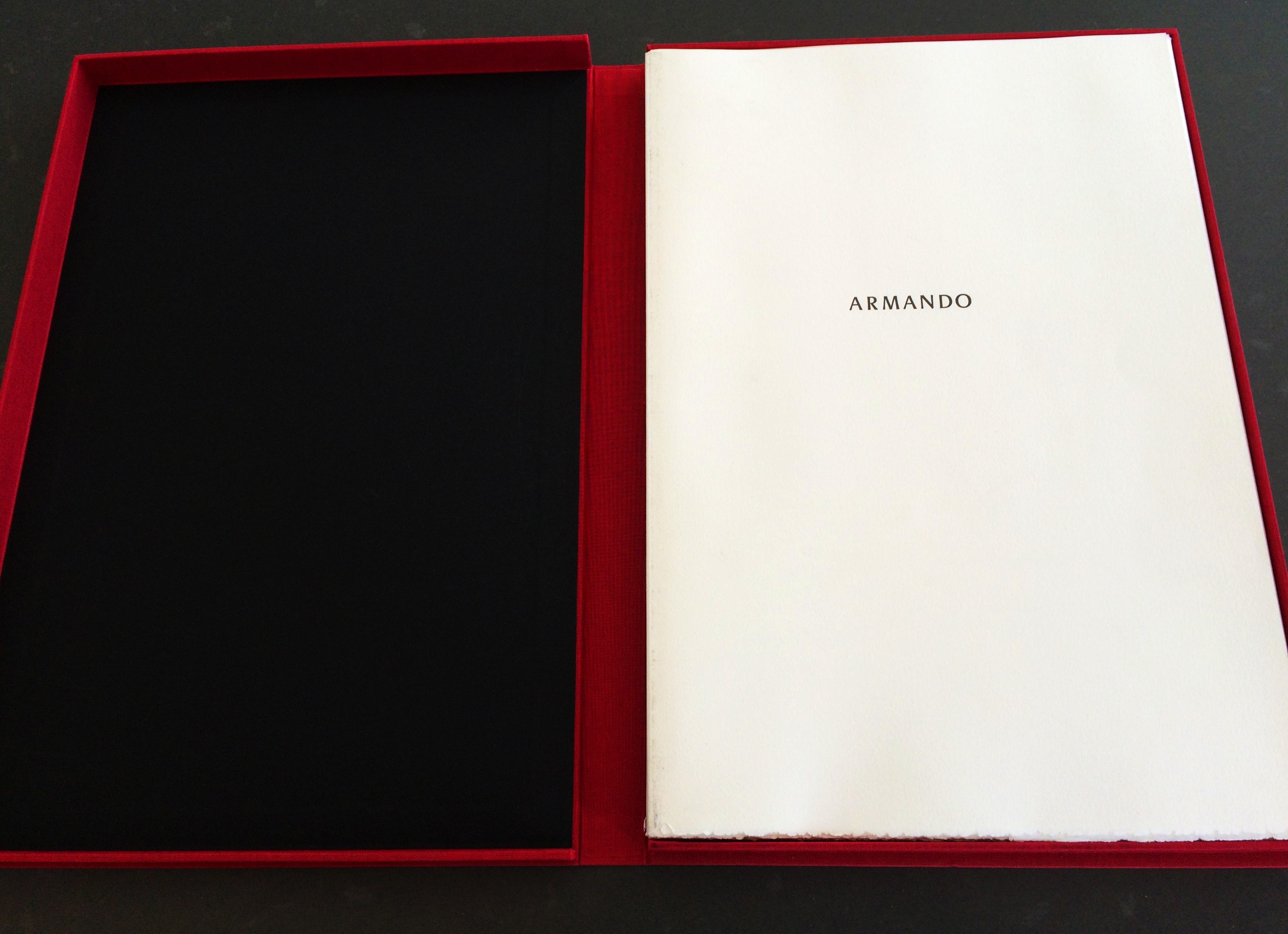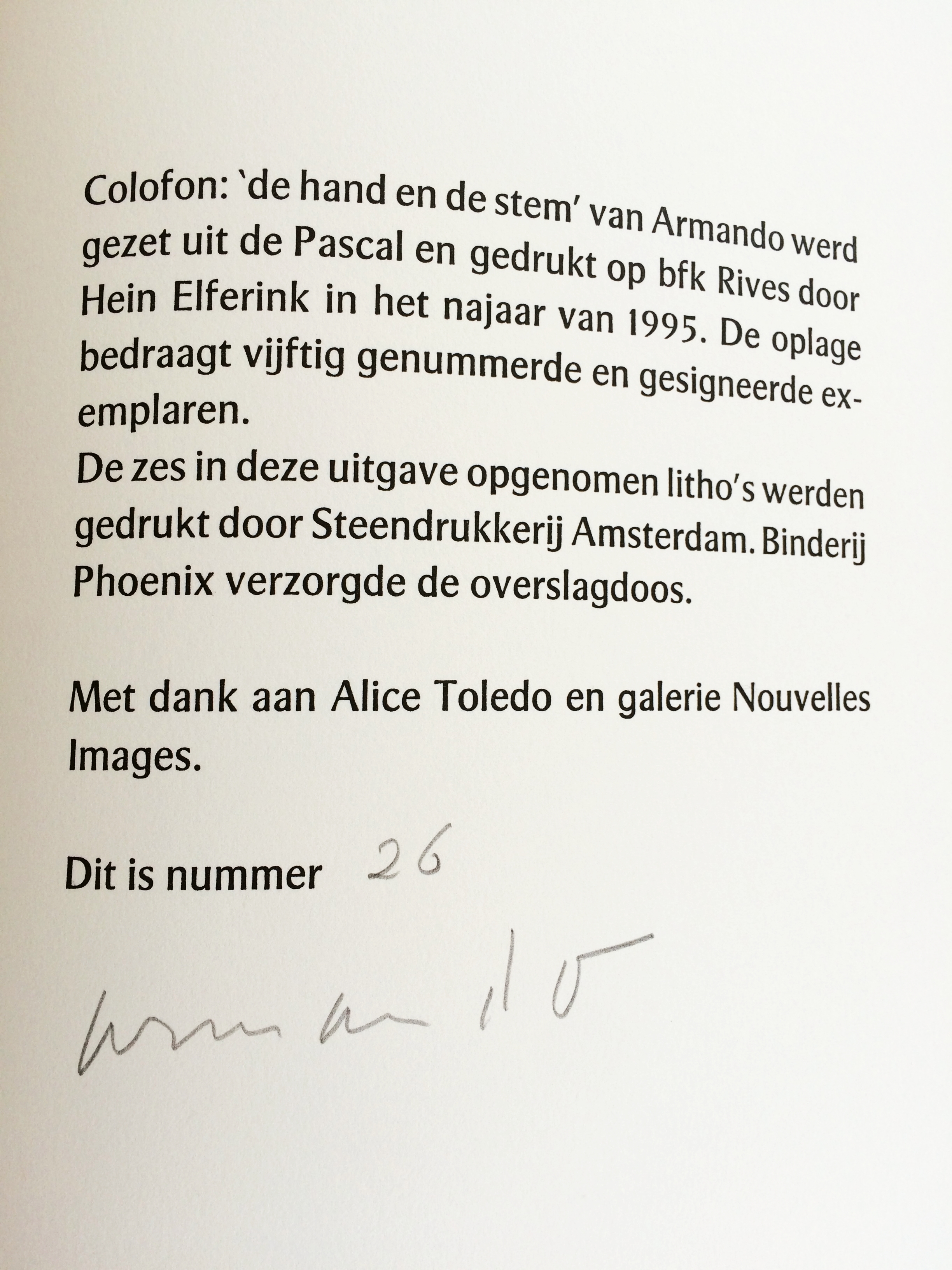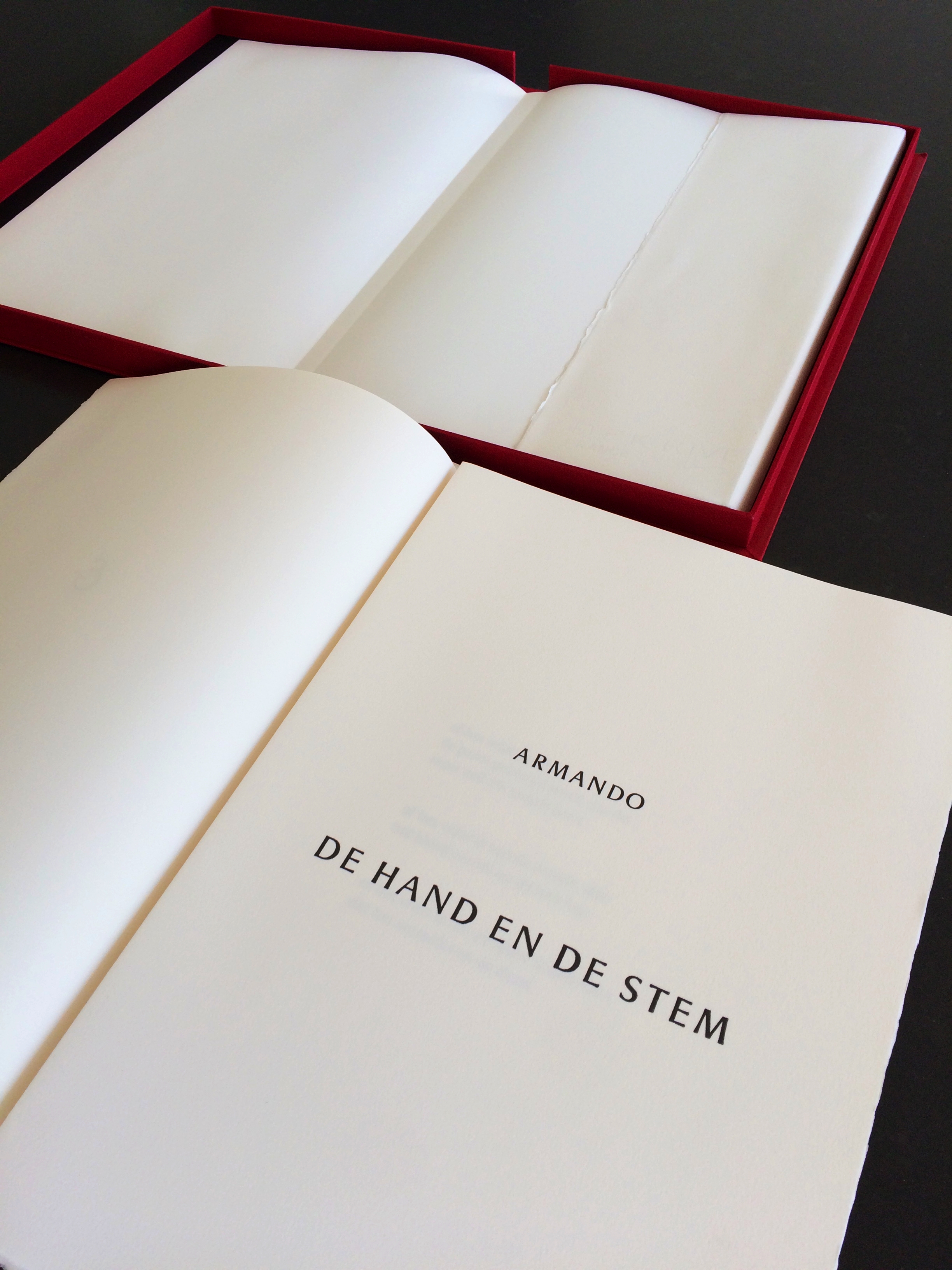 ARMANDO De hand en de stem. (Gedichten. Met zes losse, originele, genummerde en gesigneerde litho’s van de auteur). [Slingenberg], (Hein Elferink, 1995). 38,5 x 26,5 cm. Losse katernen in roodlinnen (deels zeer licht verschoten) overslagdoos (Binderij Phoenix). (60) p. Met de hand gezet uit de Pascal en gedrukt door Hein Elferink op geschept papier van bfk Rives in een oplage van 50 genummerde en gesigneerde exemplaren. 1e druk.