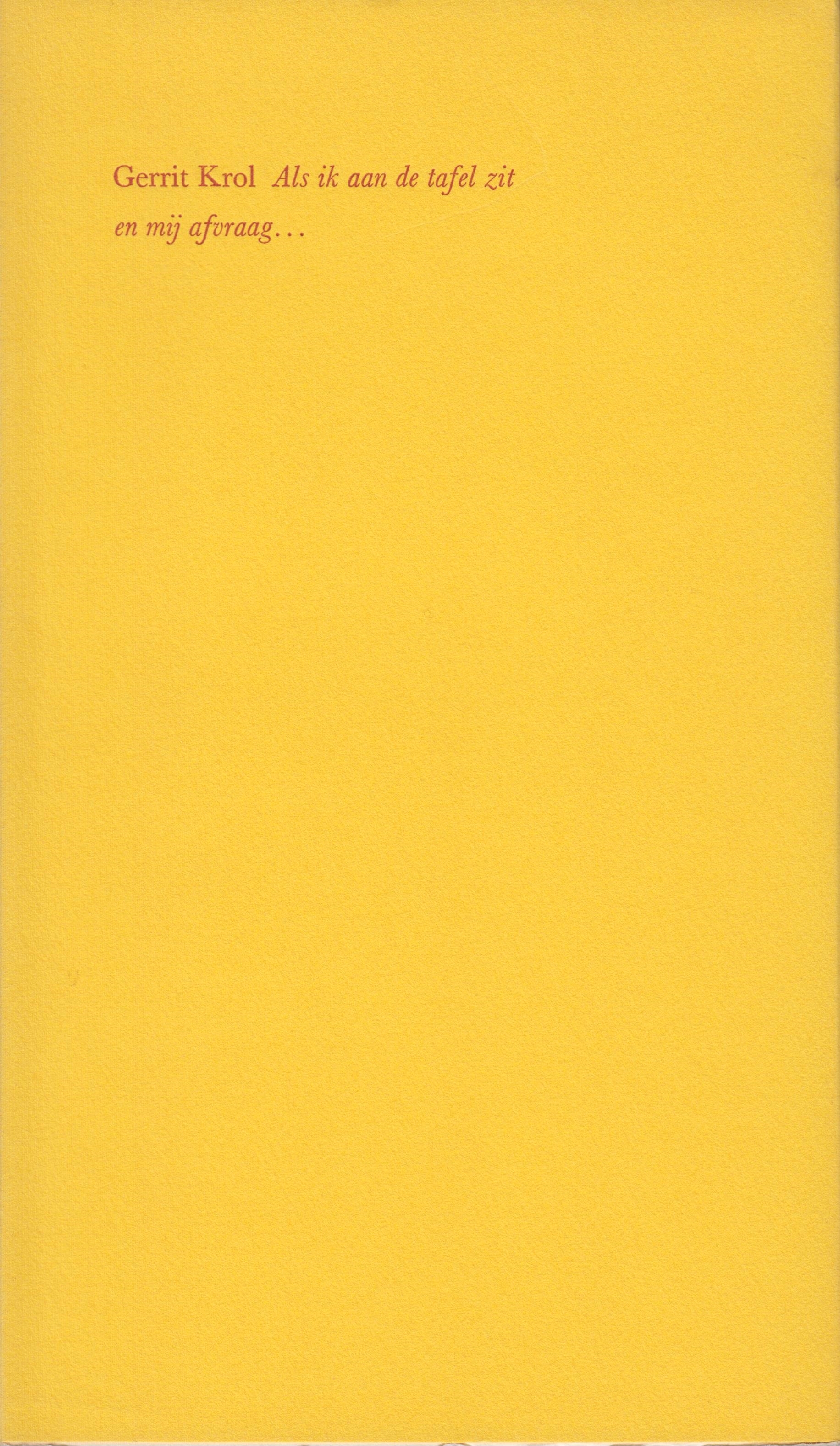 11. KROL, Gerrit Als ik aan de tafel zit en mij afvraag… Amsterdam, (J. Meijer), 1977. Ingenaaid in omslag. (2), 34 p. Met de hand gezet uit de Baskerville en gedrukt op Zerkall-Bütten in rood en zwart in een oplage van 50 genummerde exemplaren.