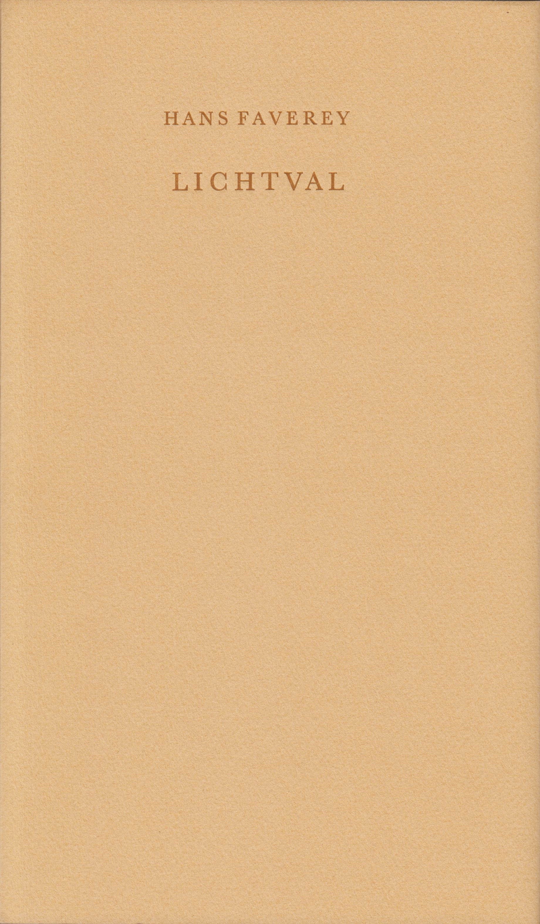 5. FAVEREY, Hans Lichtval. Amsterdam, (J. Meijer), 1978. Linnen met stofomslag. (4), 20 p. Met de hand gezet uit de Baskerville en gedrukt in bruin en zwart op Zerkall-Bütten in een oplage van 50 genummerde exemplaren.