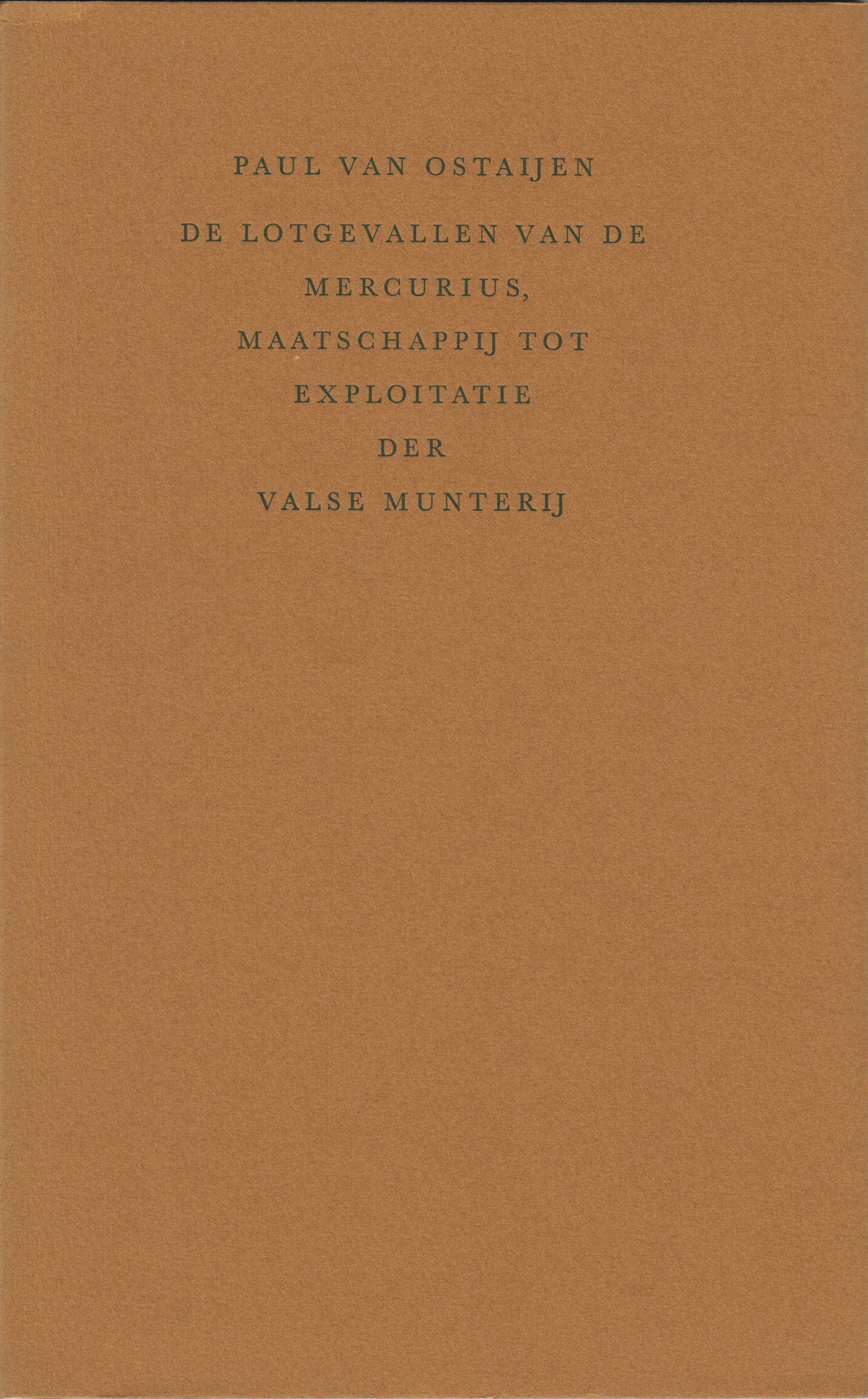 13. OSTAIJEN, Paul van De lotgevallen van de Mercurius, maatschappij tot exploitatie der valse munterij. Amsterdam, (J. Meijer), 1976. Ingenaaid in omslag. (2), 22 p. Met de hand gezet uit de Baskerville en gedrukt in groen en zwart op Zerkall-Bütten in een oplage van 35 genummerde exemplaren.