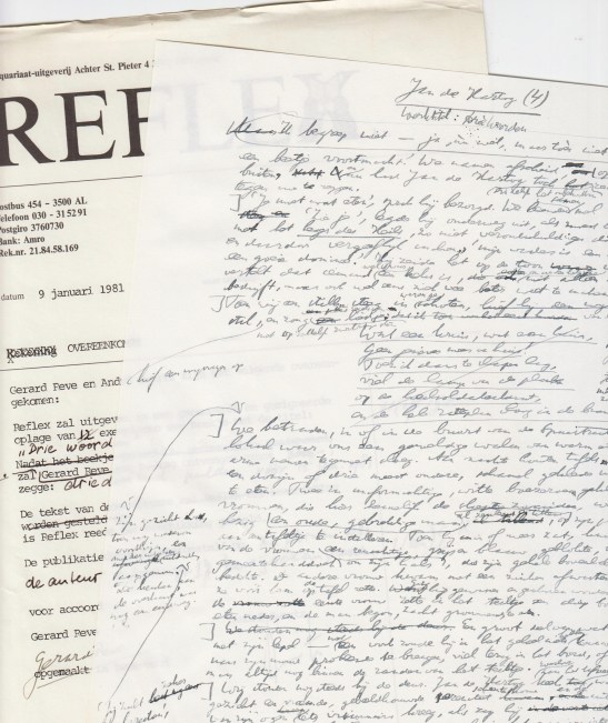 Bijgevoegd: Origineel contract tussen auteur en uitgever van deze uitgave. 29,6.x 21,0 cm. Een blad. Alleen recto. Op briefpapier van de uitgeverij. Gesigneerd door auteur en uitgever. 14 regels typoscript met correcties in handschrift van de uitgever en drie geparafeerde correcties in de marge door Gerard Reve.