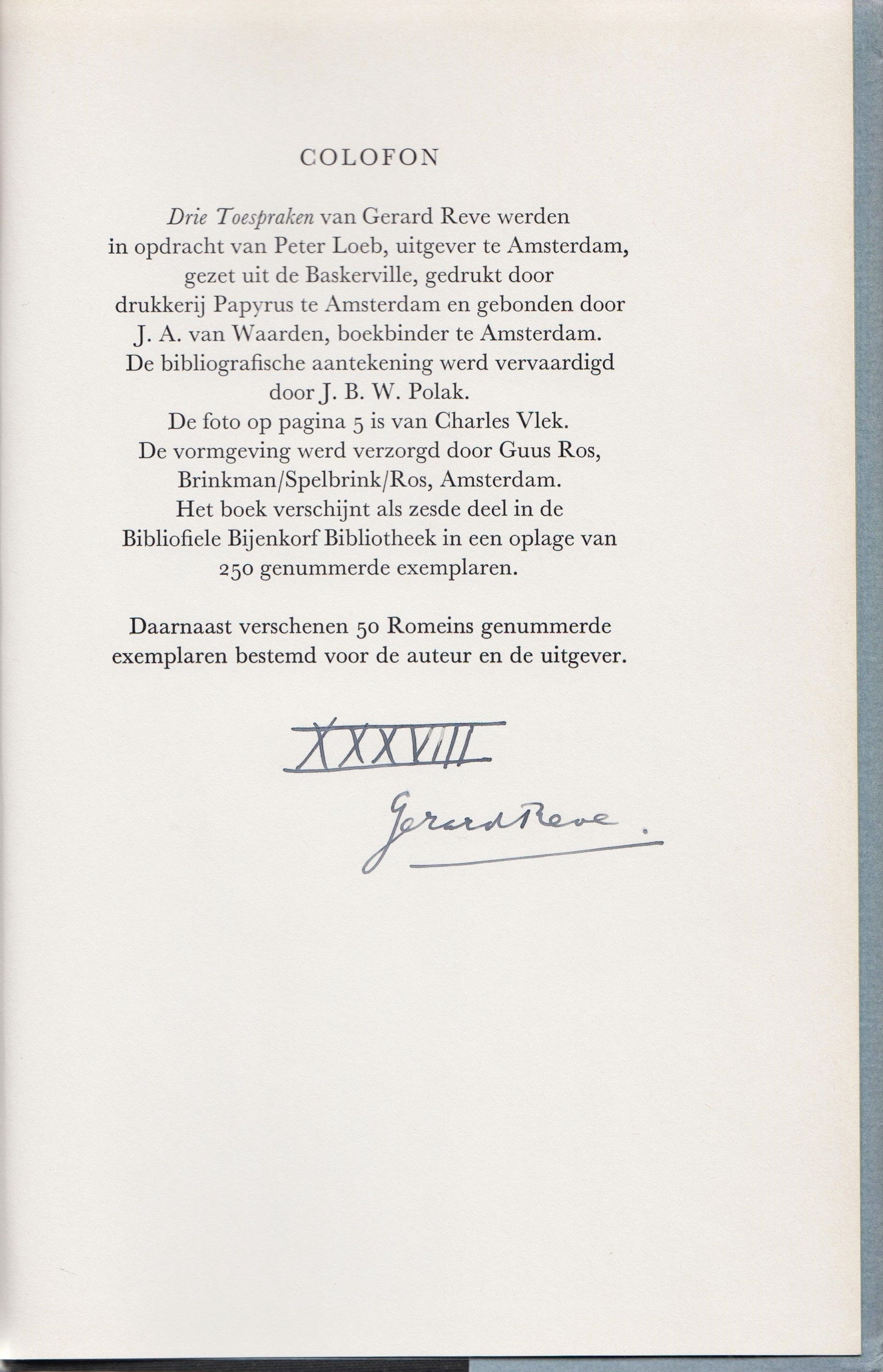 1. REVE, Gerard Drie Toespraken. (Amsterdam, Loeb), 1976. Linnen met stofomslag. 32 p. Gedrukt in een oplage van 250 [= 300] genummerde exemplaren. 1e druk. Omslag deels verschoten.