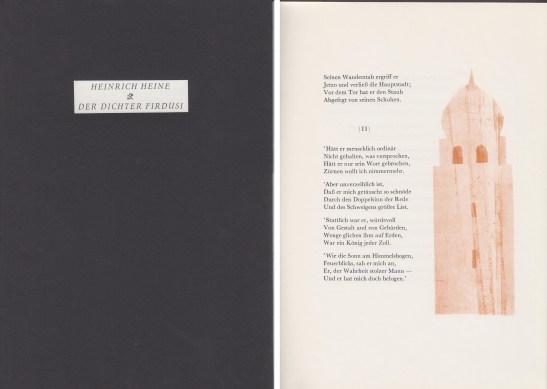 22. HEINE, Heinrich Der Dichter Firdusi. (Met twee illustraties in ‘druksel’). Haarlem, Carlinapers, 1982. 27,6 x 19,1 cm. Ingenaaid met omslag. (18) p. Met de hand gezet en gedrukt in rood en zwart in een oplage van 36 genummerde exemplaren.
