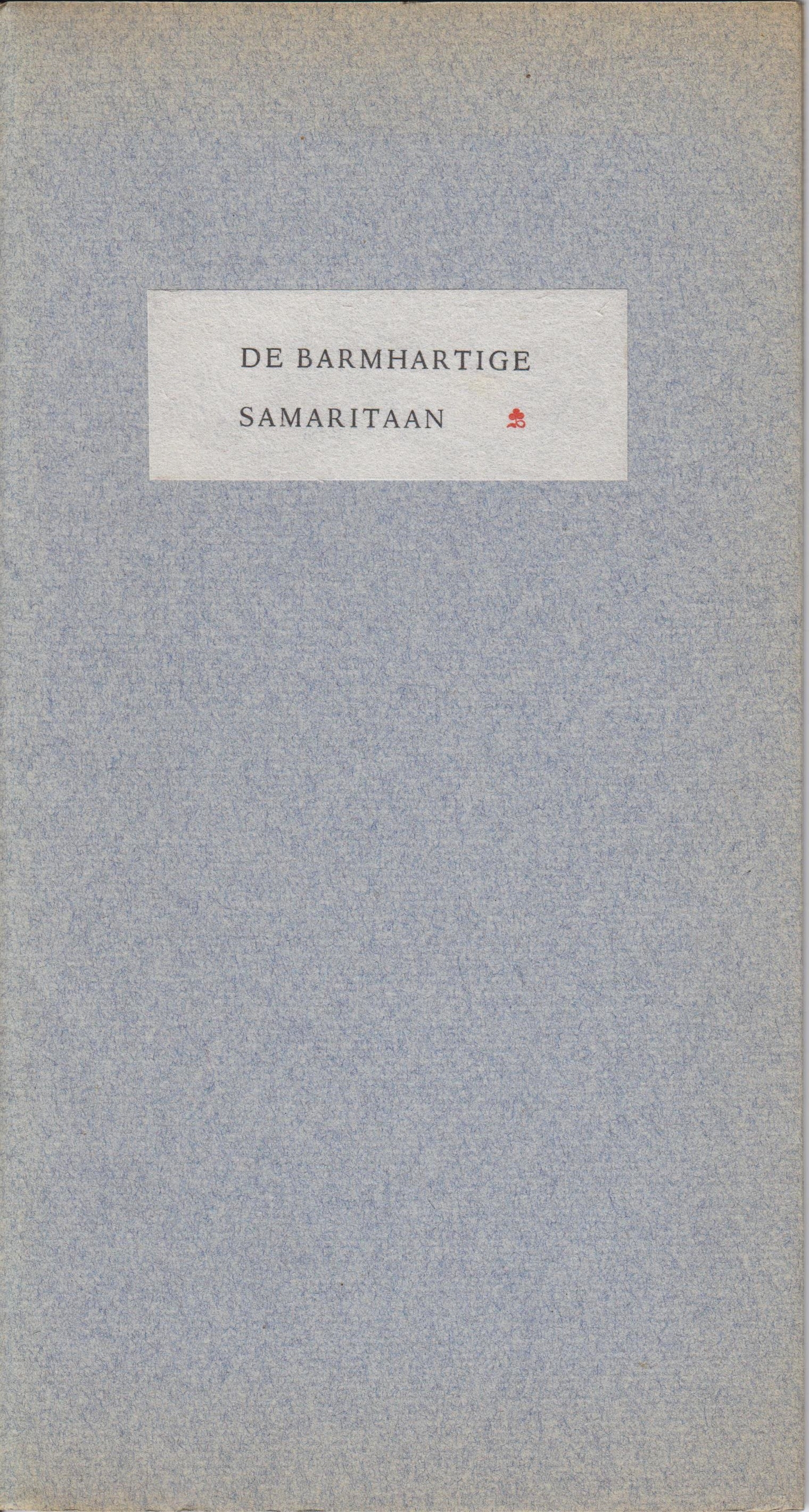 7. BIJBEL De barmhartige samaritaan. (Haarlem, Carlinapers, 1976). 29,5 x 16,0 cm. Cahiersteek met omslag. (12) p. Met de hand gezet uit de Lutetia en gedrukt in rood, blauw en zwart in een oplage van 30 genummerde exemplaren.