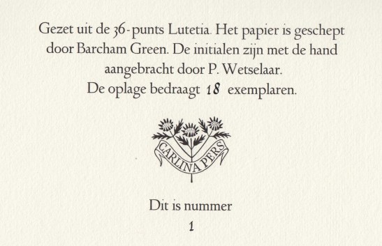 * Een lid van Stichting De Roos schreef over deze uitgave aan het bestuur: ‘Ik weet niet wat ik van dit ronduit prachtige boek meer moet bewonderen: de meesterlijke calligrafie, de smetteloze druk of de fraaie band’. Leeflang 123.