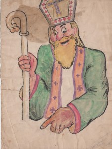 – Sint Nicolaas. 35,5 x 26,0 cm. Potloodschets uitgewerkt in oostindische inkt en aquarel op tekenpapier: een lachende Sinterklaas met de staf in de rechterhand wijst naar onder, mogelijk naar een buiten de tekening liggend cadeau. Kennelijk deels overgetekend naar een voorbeeld, misschien uit een advertentie of jeugdtijdschrift. Rechtsonder in potlood: ‘Geteekend/ door/ Hugo!’. Aan de randen gescheurd en gekreukt, punaisegaatje; tussen staf en mijter een bruine vochtvlek. Aan de een kleine schets (6 x 3 cmachterkant ) van ongeveer dezelfde voorstelling in inkt.
