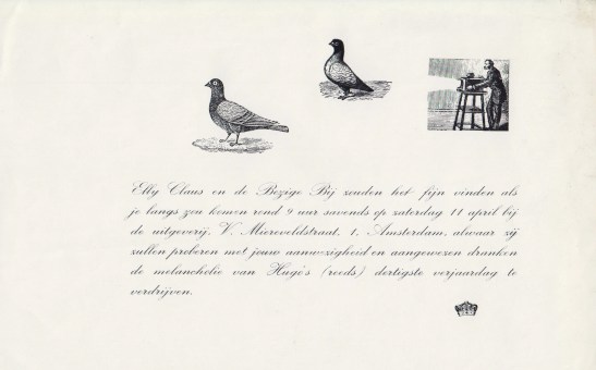 * ‘Elly Claus en de Bezige Bij zouden het fijn vinden als je langs zou komen rond 9 uur savends op zaterdag 11 april [1959] bij de uitgeverij, V. Miereveldstraat, 1, Amsterdam, alwaar zij zullen proberen met jouw aanwezigheid en aangewezen dranken de melancholie van Hugo’s (reeds) dertigste verjaardag te verdrijven’.