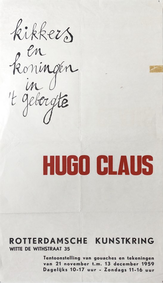 7. CLAUS, Hugo (Affiche). Kikkers en koningen in ’t gebergte. 62 x 36 cm. Rotterdamse Kunstkring. Tentoonstelling van gouaches en tekeningen van 21 november t.m. 13 december 1959. Driemaal gevouwen, kleine beschadigingen aan de hoeken, scheurtje met sellotapevlek aan rechterkant.