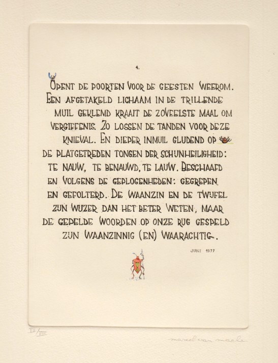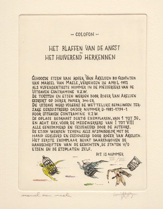 3. MAELE, Marcel van Het blaffen van de angst of Het huiverend herkennen. (Met originele, genummerde, handgekleurde en gesigneerde etsen door Roger Van Akelijen). [Antwerpen], (Contramine, 1982). 40 x 27 cm. Losbladig (als uitgegeven) in omslag. (12) bladen. Geheel geëtst op Dürer 300 grams in een oplage van slechts 38 door dichter en kunstenaar genummerde en gesigneerde exemplaren. 1e druk.