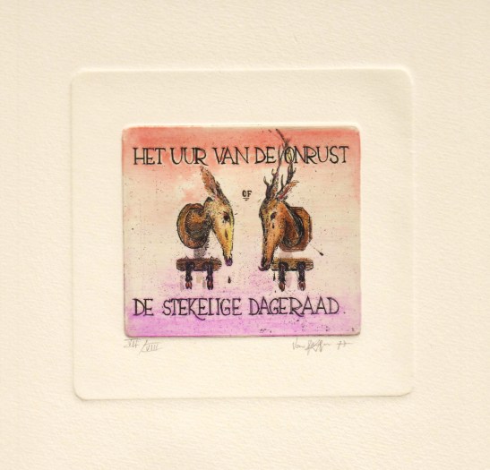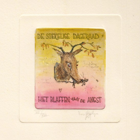 2. MAELE, Marcel van De stekelige dageraad of Het blaffen van de angst. (Met originele, genummerde, handgekleurde en gesigneerde etsen door Roger Van Akelijen). [Aalst], (Hooft, 1980). 40 x 27 cm. Losbladig (als uitgegeven) in omslag. (12) bladen. Geheel geëtst op Dürer 300 grams in een oplage van slechts 38 door dichter en kunstenaar genummerde en gesigneerde exemplaren. 1e druk.