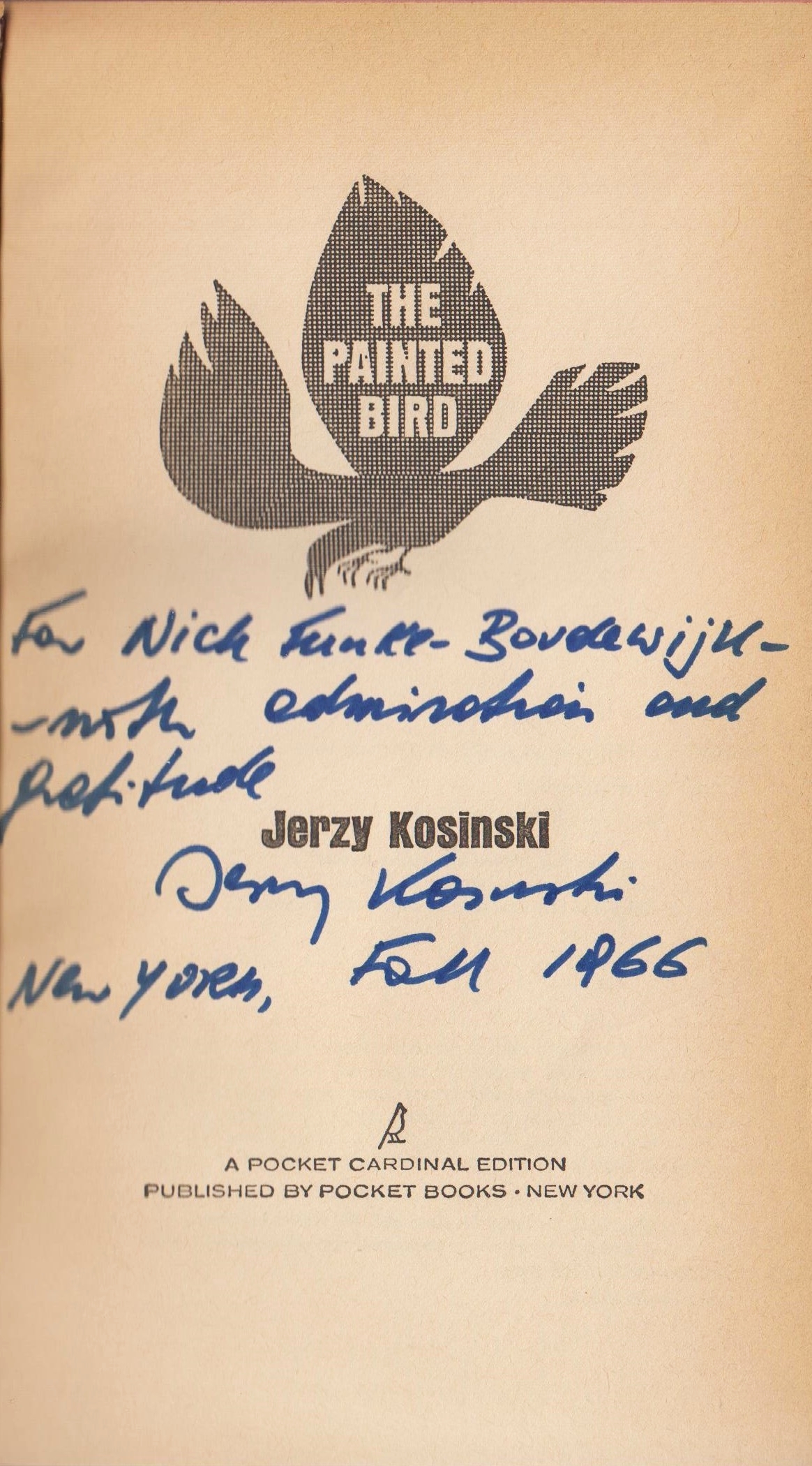 * Exemplaar met handgeschreven, gesigneerde opdracht van de auteur op de titelpagina: ‘For Nick Funke-Bordewijk -/ – with admiration and/ gratitude/ Jerzy Kosinski/ New York, Fall 1966’.