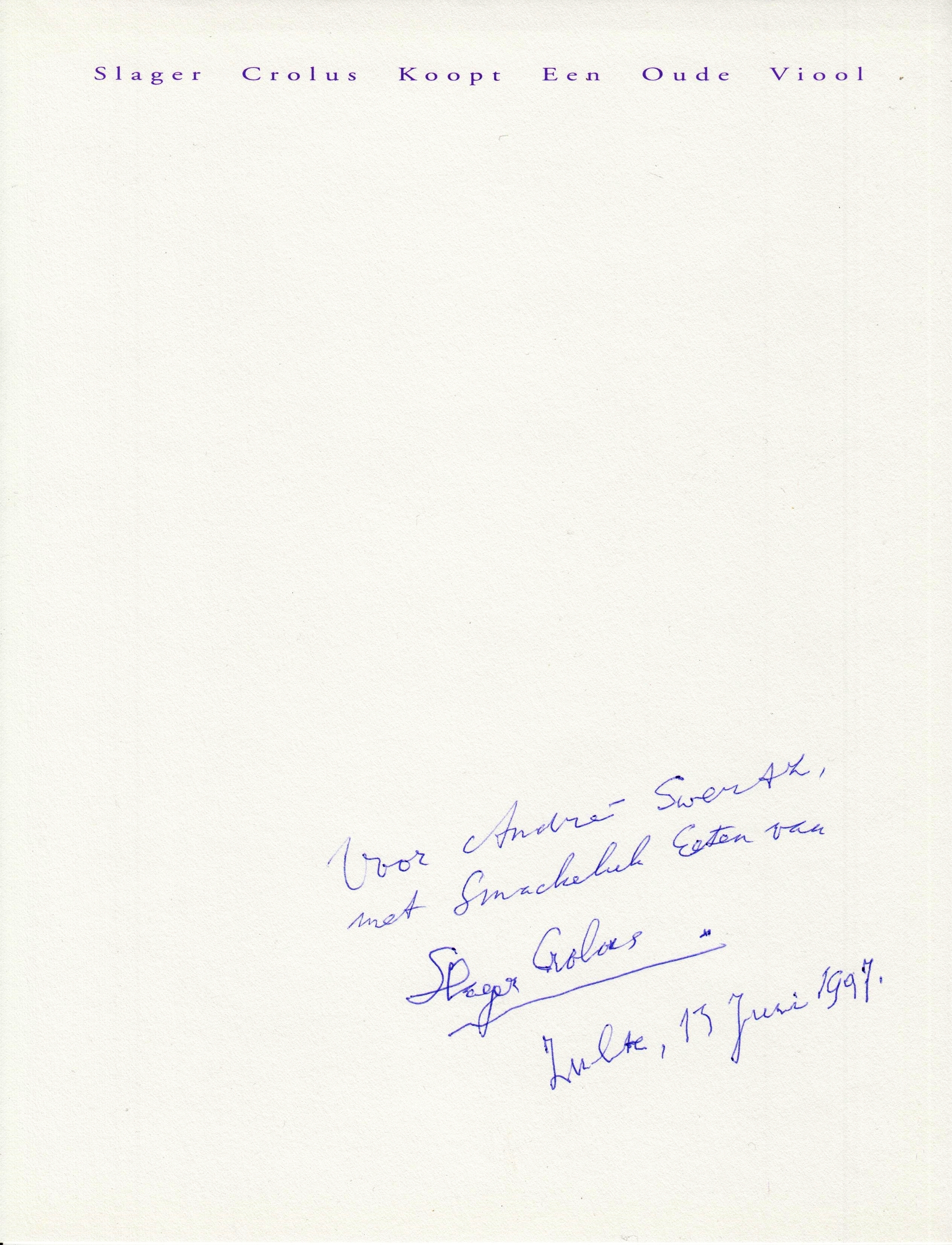 * Dit exemplaar, gemerkt ‘H.C.’ werd onder het colofon gesigneerd door Gerard Reve en Vincent Mentzel. Bovendien met een fantastische, handgeschreven opdracht van de auteur op het voorste blad: ‘Voor André Swertz,/ met Smackeluk Eeten van/ Slager Crolus./ Zulte, 13 Juli 1997.’