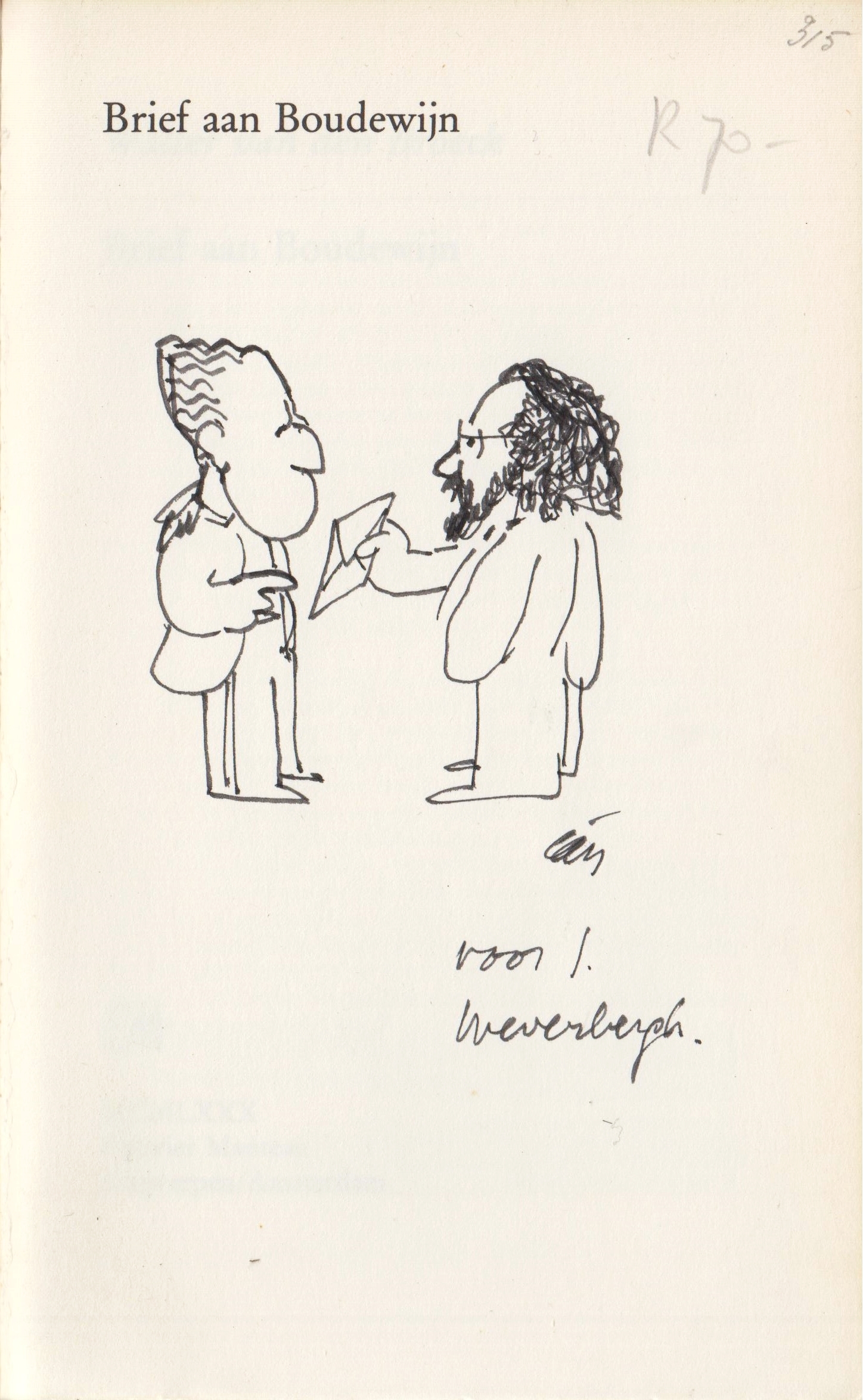 * Exemplaar met handgeschreven, gesigneerde opdrachttekening van de auteur aan zijn uitgever op de Franse titel: ‘voor J. Weverbergh’. De goed gelijkende tekening stelt de auteur voor die koning Boudewijn een brief aanbiedt.