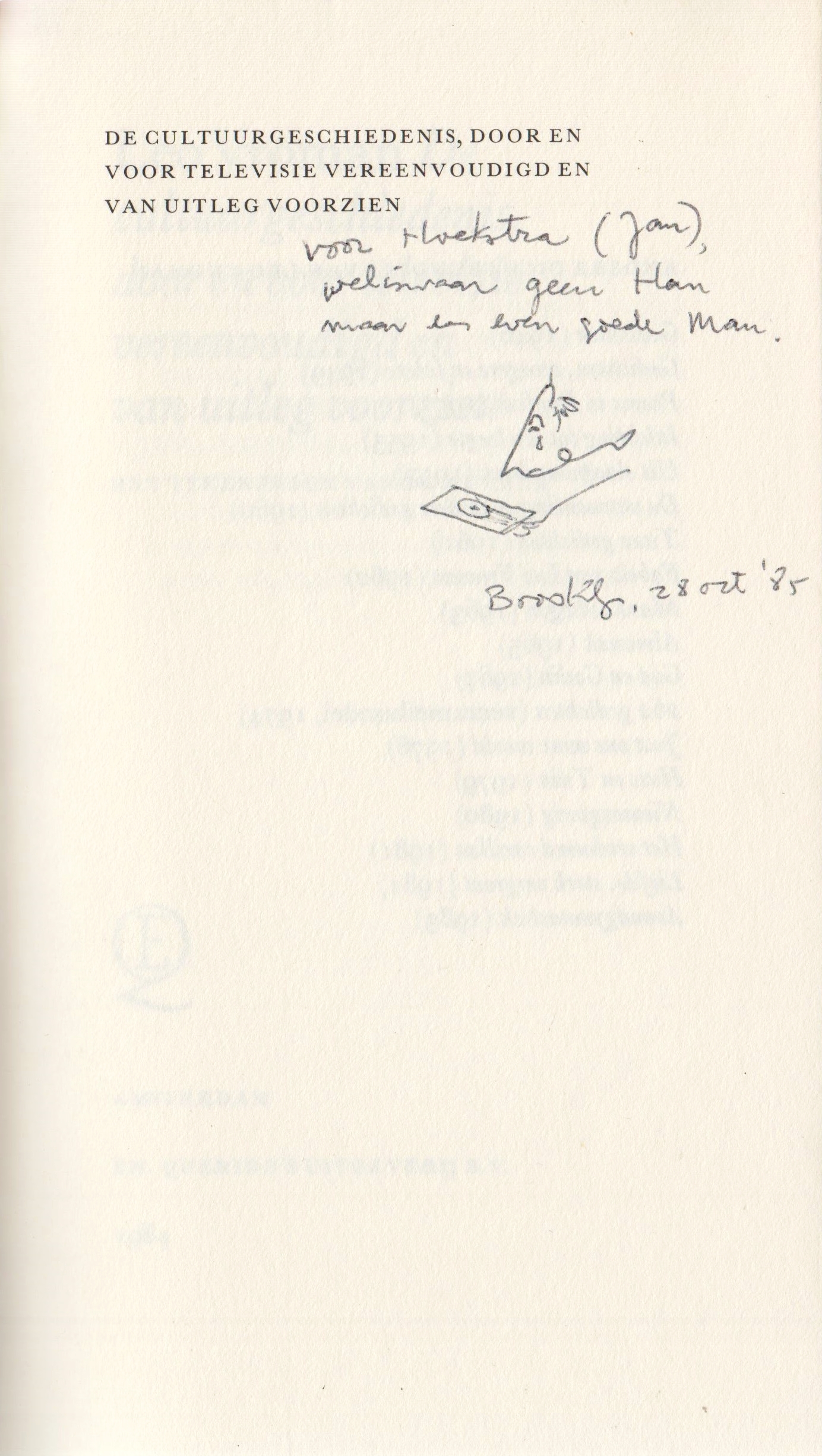 30. VROMAN, Leo De cultuurgeschiedenis, door en voor televisie vereenvoudigd en van uitleg voorzien. Met tekeningen van de auteur. Amsterdam, Querido, 1984. Ingenaaid met omslag. 28 p. 1e druk. Omslag deels verschoten.