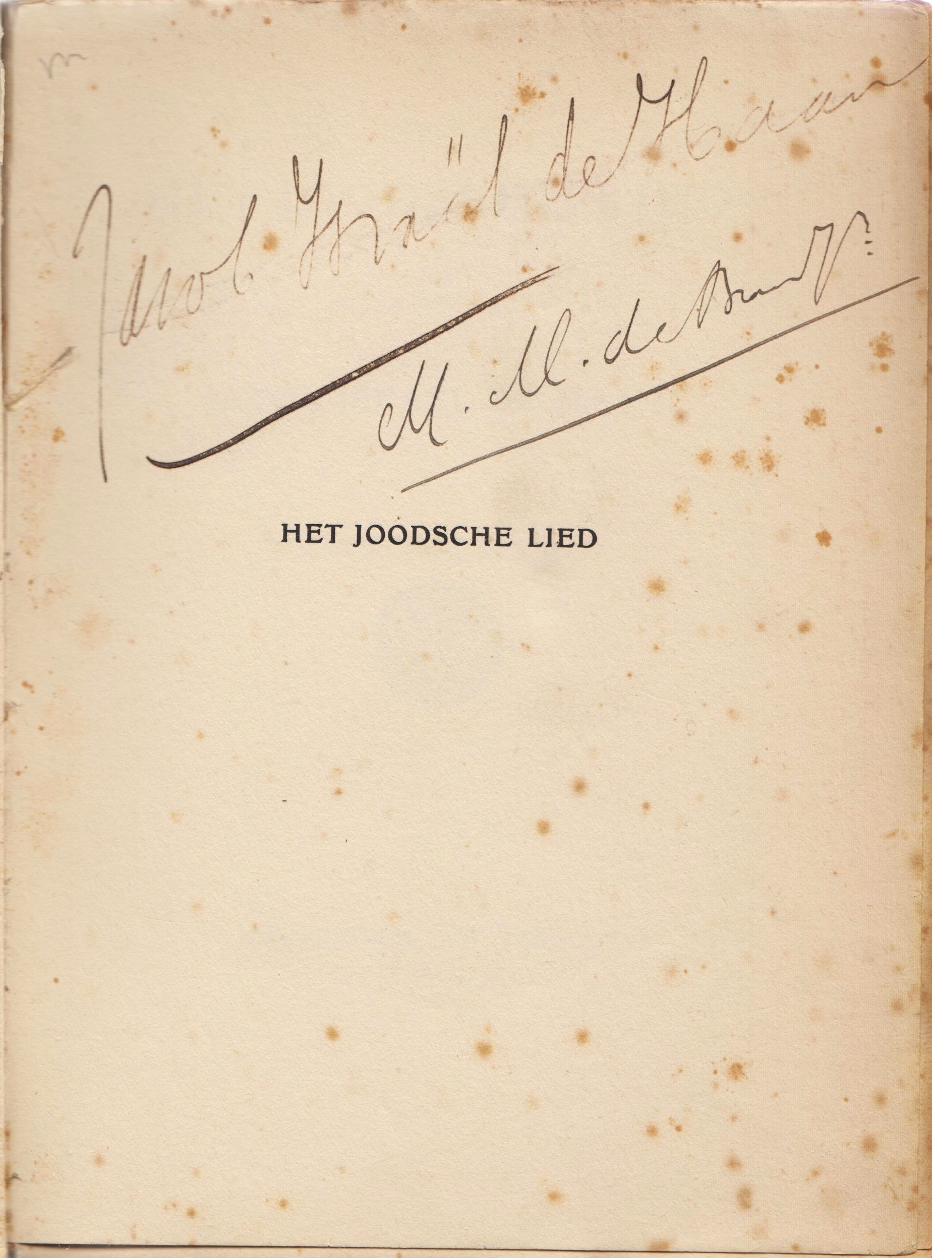 7. HAAN, Jacob Israël de Het Joodsche lied. Amsterdam, W. Versluys, 5676 (1915). Ingenaaid. 236 p. 1e druk. Voor- en achterin beetje roest.