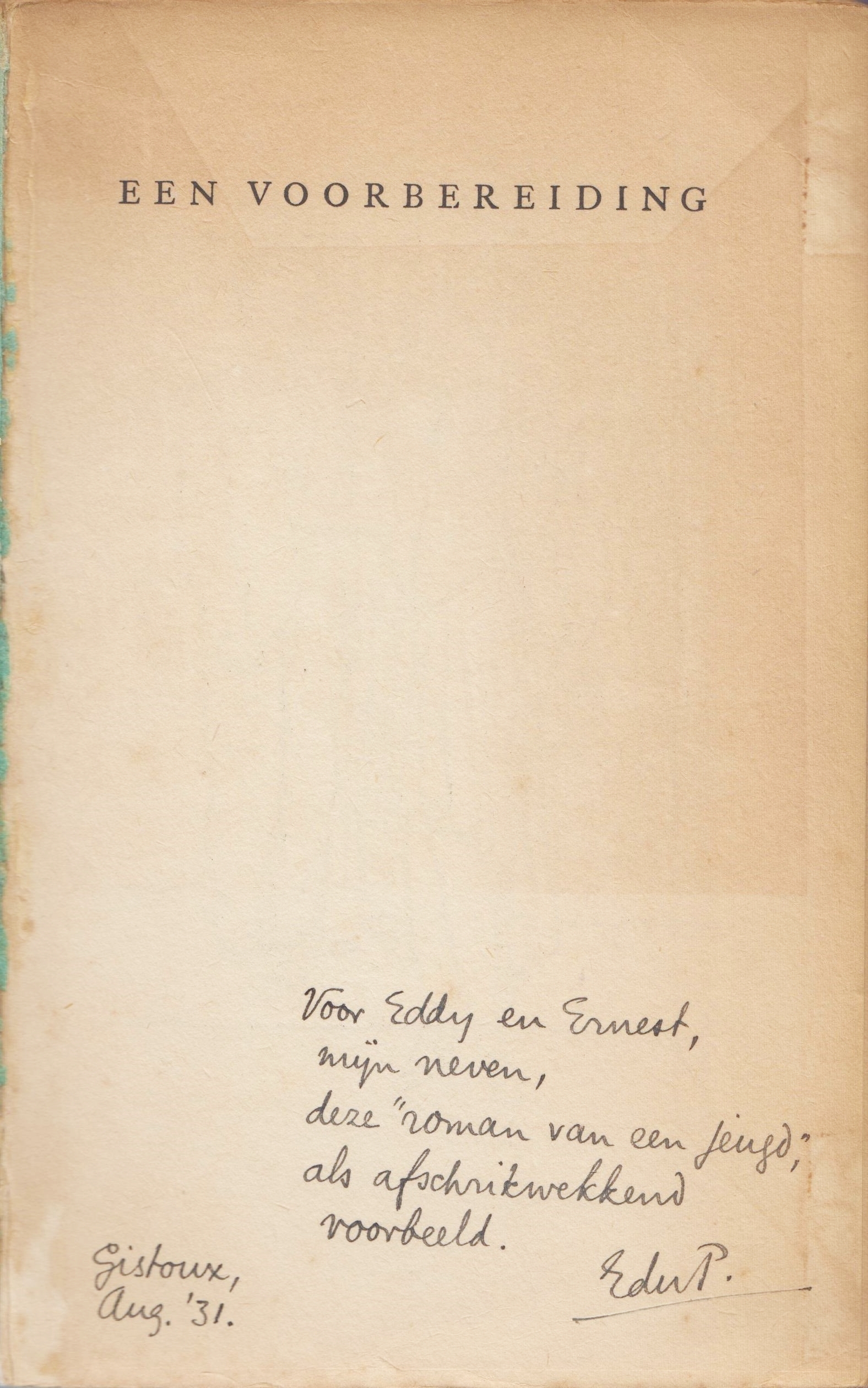 * Exemplaar met handgeschreven, gesigneerde opdracht van de auteur op de Franse titel: ‘Voor Eddy en Ernest [van Polanen Petel],/ mijn neven,/ deze “roman van een jeugd”,/ als afschrikwekkend/ voorbeeld./ EduP./ Gistoux,/ Aug. ’31’.