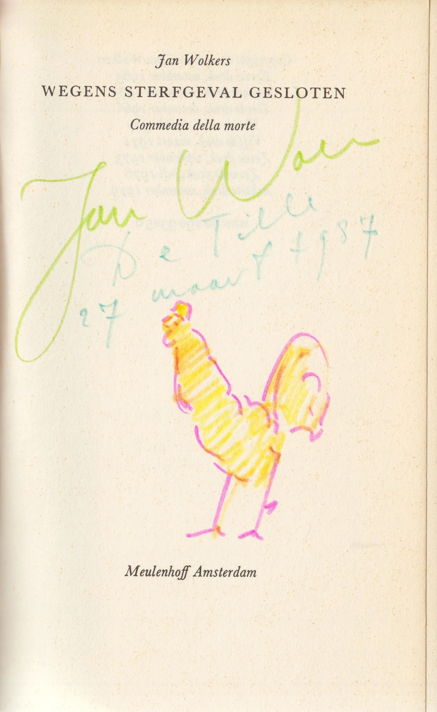 * Exemplaar met gesigneerde tekening van een kip op de Franse titel: ‘Jan Wol/ De Tille/ 27 maart 1987’.