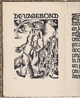 23. ROLAND HOLST, A. De vagebond. (Met twee houtsneden door N. Eekman, de teksten en omslagpapier werden uit hout gesneden door Fokko Mees). [Den Haag], Vereeniging tot Bevordering der Grafische Kunst, 1930. Cahiersteek. (16) p. Gedrukt door S.H. de Roos op zijn eigen handpers op Keizerlijk Japans in een oplage van 100 genummerde en door Eekman en Mees gesigneerde exemplaren. Mooi exemplaar.