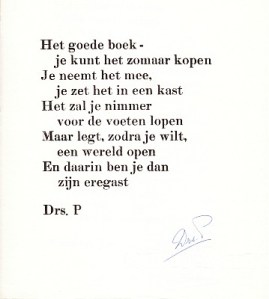 * Gedrukt ter gelegenheid van en tijdens de Nationale Boekentiendaagse. Bevat gedichten van Huub Beurskens, Drs. P, Hans Faverey, Jan Kuijper, Peter Nijmeijer, Bert Schierbeek, Hans Tentije, Willem van Toorn, Elly de Waard en Driek van Wissen. Deze bundel is eigenlijk een bundeling plano’s. Alle bijdragen werden door de dichters gesigneerd.