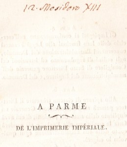 2. (BODONI). MOREAU DE SAINT-MÉRY, M.-L.-É. Vu le Décret Impérial du 20 Prairial an XIII… (= June 8, 1805). Arrête. Parma, Imprimerie Impériale, [1805]. Zonder omslag. 8 p. In het Frans en het Italiaans. Iets stoffig. Met oudtijds handgeschreven datum op de laatste pagina: ’12 Mesidoro XIII’, ofwel 1 juli 1805.