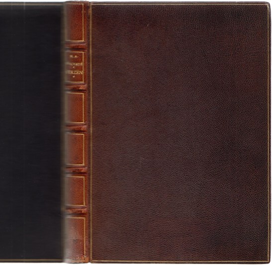 * – Een van 25 Romeins genummerde exemplaren op Keizerlijk Japans papier. Gebonden in rood heelmarokijn met vijf ribben, titel in goud en gemarmerde schutbladen, kop verguld (uitgeversband van Louis Malcorps).
