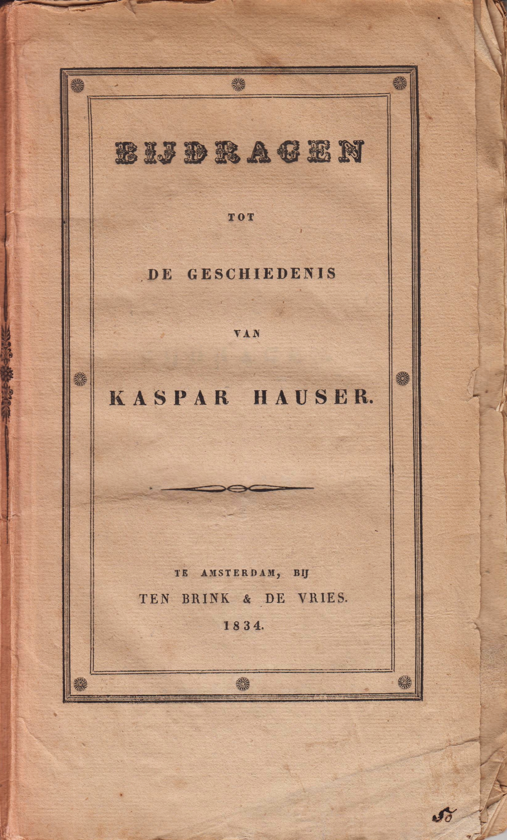 17. (HAUSER, Kaspar) Bijdragen tot de geschiedenis van Kaspar Hauser. Amsterdam, Ten Brink & De Vries, 1834. Oorspronkelijk uitgeversomslag. (4), IV, 44 p. Niet afgesneden. 1e druk. Wat gekreukt, schuingelezen, oudtijds handgeschreven nummertje ’50 ‘, vlekje op achterzijde, maar een mooi boekje in zijn originele typografische omslag.