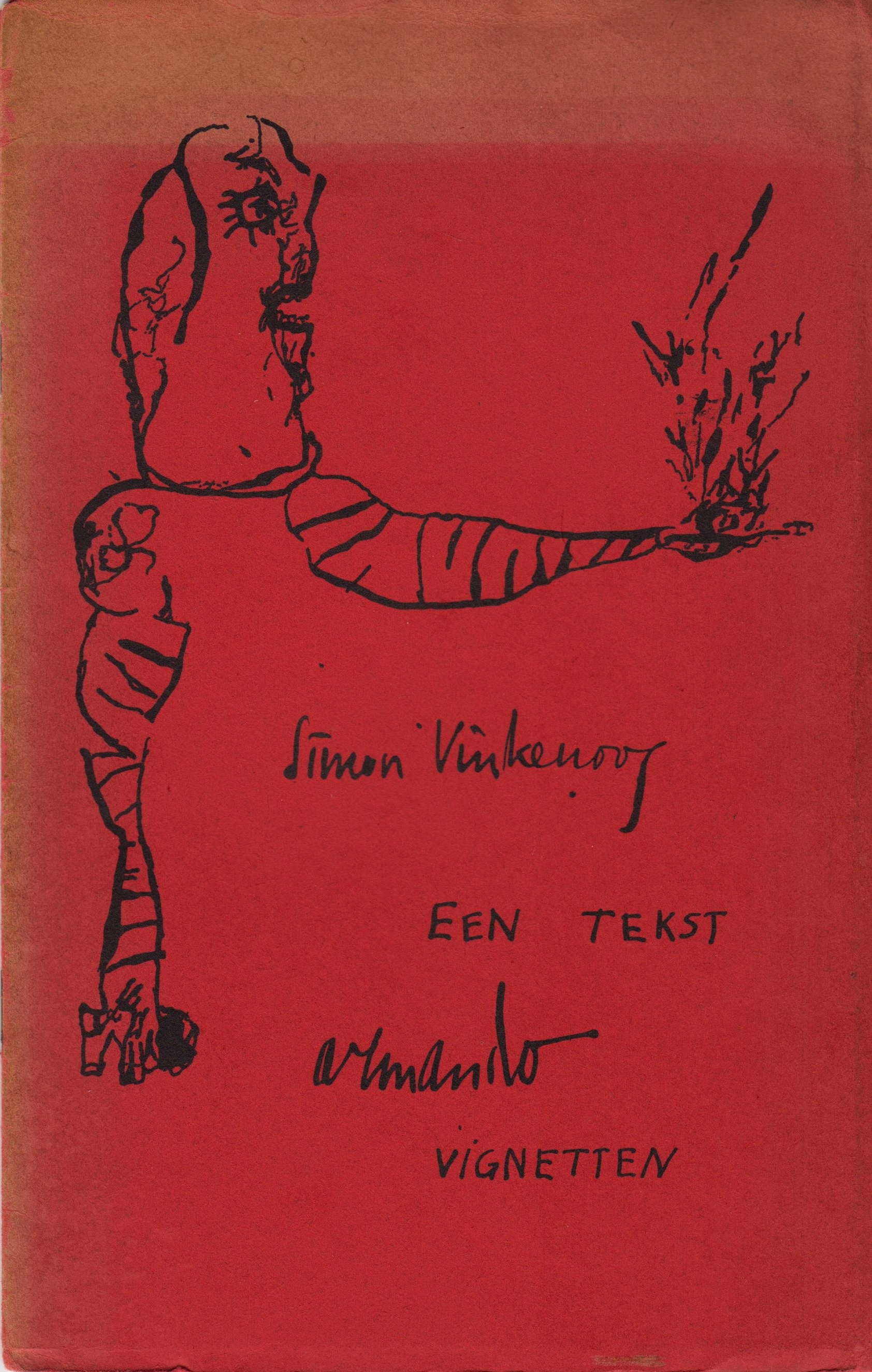 2. ARMANDO en Simon VINKENOOG Een tekst (van Simon Vinkenoog met tekeningen van Armando). (Amsterdam), [Eigen beheer], (1957). Geniet. (8) p. Gedrukt in een oplage van 150 genummerde en door auteur en kunstenaar gesigneerde exemplaren. Voorzijde omslag aan bovenzijde verschoten.
