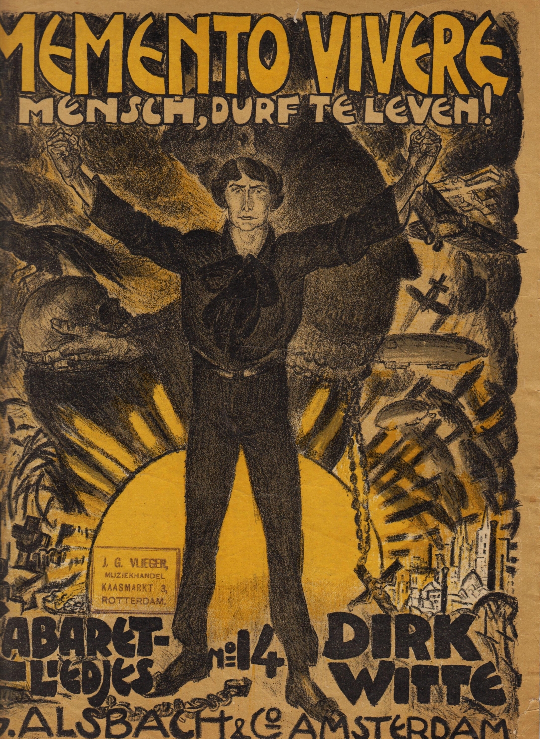 11. (GESTEL, Leo). WITTE, Dirk Mensch, durf te leven! Memento Vivere. Cabaretliedjes No. 14. Amsterdam, G. Alsbach & Co., (ca. 1918). 31,1 x 24,0 cm. Vouwblad. Stempeltje van de Rotterdamse muziekhandel Vlieger voorop. Scheurtje rechts onderaan.