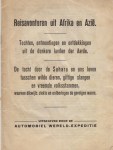 41. WIJDENES, G. Reisavonturen uit Afrika en Azië. Tochten, ontmoetingen en ontdekkingen uit de donkere landen der Aarde. De tocht door de Sahara en ons leven tusschen wilde dieren, giftige slangen en vreemde volksstammen, waarvan dikwijls ziekte en ontberingen de gevolgen waren. (Zonder plaats), Automobiel Wereld-expeditie, [1929]. 32 p. Enige slijtagesporen.