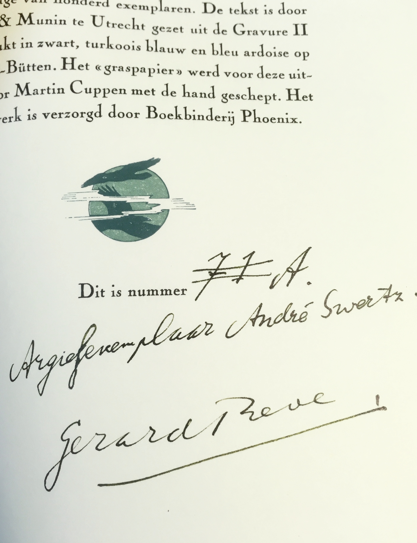 Dit exemplaar werd niet genummerd, maar onder het colofon staat ‘(gedrukt:) Dit exemplaar is gedrukt voor (geschreven:) André Schwertz [sic!]’.