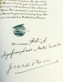 * Dit exemplaar is door Reve genummerd ’71’, maar dat is door Reve doorgestreept. Hij schreef er achter ‘A./ Argiefexemplaar André Swertz./ Gerard Reve.’