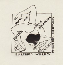 * Door Hermans zelf vervaardigd exlibris: een naakte jonge vrouw in een lenige pose met een brandende sigaret tussen haar tenen. Daar omheen en tussendoor de tekst ‘Pour ung plaisir mille doulours/ Villon/ exlibris Willem Frederik Hermans’.