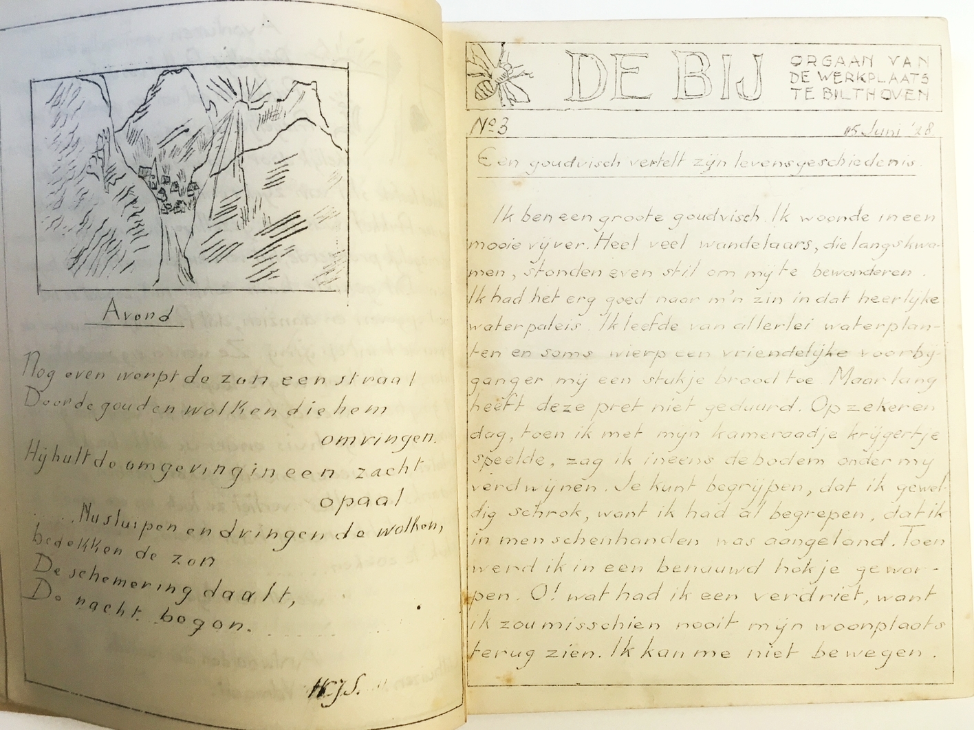 40. WERKPLAATS, De De Bij. Orgaan van de Werkplaats te Bilthoven. Nr. 1-50. (Bilthoven, De Werkplaats Kindergemeenschap), 1928-1932. Grijs-blauwe linnen privéband. Ca. 200 p. Geheel gestencild. Met tekeningen, waarvan er twee met kleurpotlood gekleurd zijn.