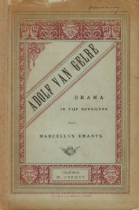 9. EMANTS, Marcellus Adolf van Gelre. Drama in vijf bedrijven. Den Haag, W. Cremer, [1888]. Ingenaaid met gebruikmaking van het originele Victoriaanse uitgeversomslag, bedrukt in paars, groen en zwart. (6), 176 p. Niet afgesneden. 1e druk. Omslag aan de randen iets versleten en gerepareerd.
