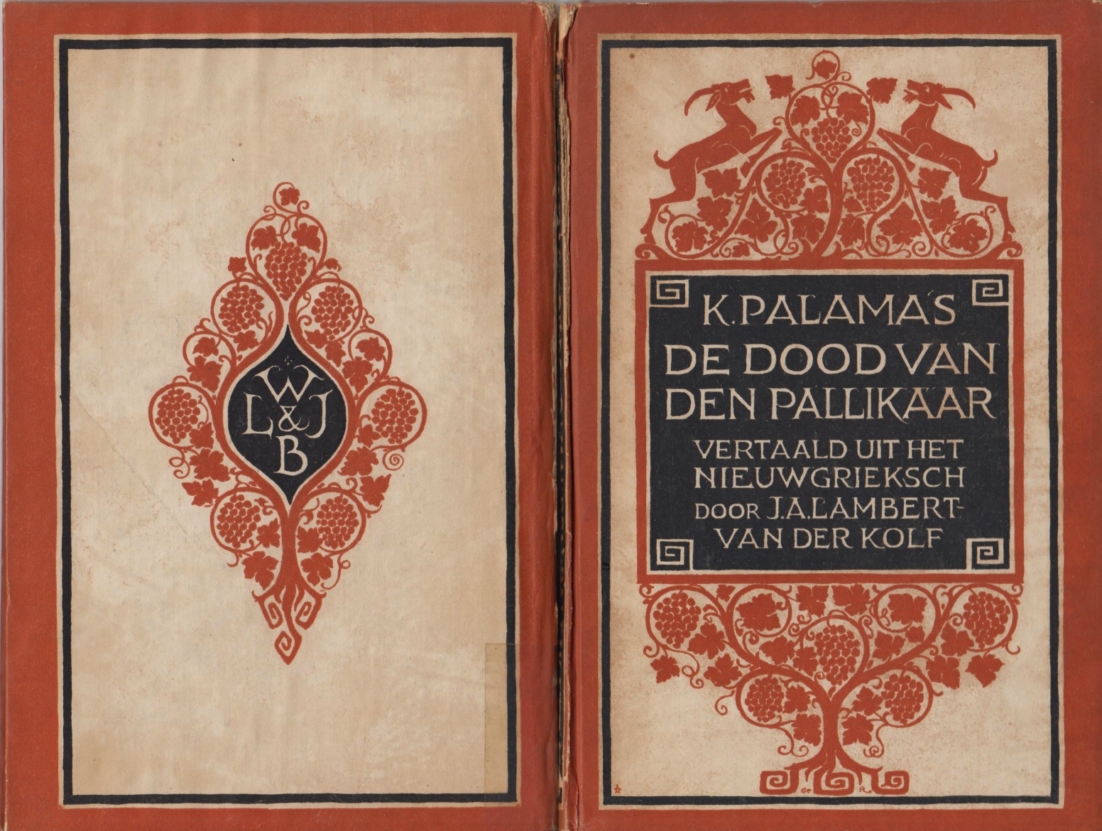 6. CHATZOPOULOS, CHRISTOVASILIS, EFTALIOTIS, KARKAVITSAS, PALAMAS, PSYCHARIS, VIKELAS Serie ‘Nieuwgrieksche romans en novelles’, in 8 delen, op 1 na compleet. Rotterdam, W.L. & J. Brusse, 1920-1924. Uniforme kartonnen boekband met versiering van rug, voor- en achterkant door S.H. de Roos in bruin en zwart. 50-100 p., alleen nr. 5 telt 228 p. en is herbonden in een blind bandje. 1e drukken. De originele banden zijn zeer breekbaar en in matige staat.