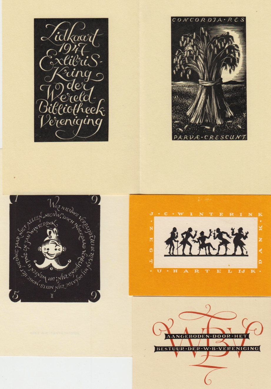 38. VOSS, H.D. Drie nieuwjaarswensen en een dankkaart van J.C. Winterink, directeur van de Wereldbibliotheek. Ca. 1955-1960. Verschillende formaten tussen 16 x 12 en 7 x 11 cm. Door Voss geknipte silhouetten met teksten gedrukt op getint papier. Bijgevoegd: twee soortgelijke drukwerken van de Wereldbibliotheekvereniging en de Ex-Libriskring der W.B.V. Achterop wat plakspoortjes, verder gaaf en mooi.