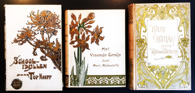* Met goud-geel-groene art-nouveau-lelies op crème linnen. Een van de prachtige jugendstilboekbanden die Cornelia van der Hart (1851-1940) begin twintigste eeuw maakte voor uitgeverij Becht. Voor een kort overzicht zie Braches p. 1309.
