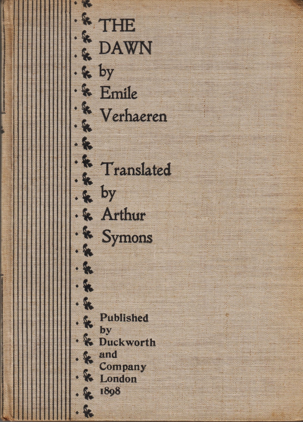 37. VERHAEREN, Emile The Dawn (Les Aubes). Translated by Arthur Symons. London, Duckworth & Company, 1898. Linnen. (4), 112, (12) p. 1e druk. Wat roest, vooral achterin. Ingeplakte krantenfoto.