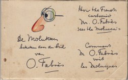 11. FABRÈS, Oscar De Molukken bekeken door den bril van O. Fabrès = How the French cartoonist Mr. O. Fabrès sees the Molucca’s = Comment M. O. Fabrès voit les Moluques. [Batavia], KPM (Koninklijke Paketvaart Maatschappij), 1933. Oblong 11 x 16 cm. Afscheurboekje. Origineel omslag met overstekende randjes. 6 p. tekst + 12 ansichtkaarten in kleuren, waarvan één zelfportret van de kunstenaar, en 11 afscheurbare ansichten met toelichting op velletjes vloeipapier. 1e druk. Kleine vlekjes op omslag, enkele kreukjes. Compleet.