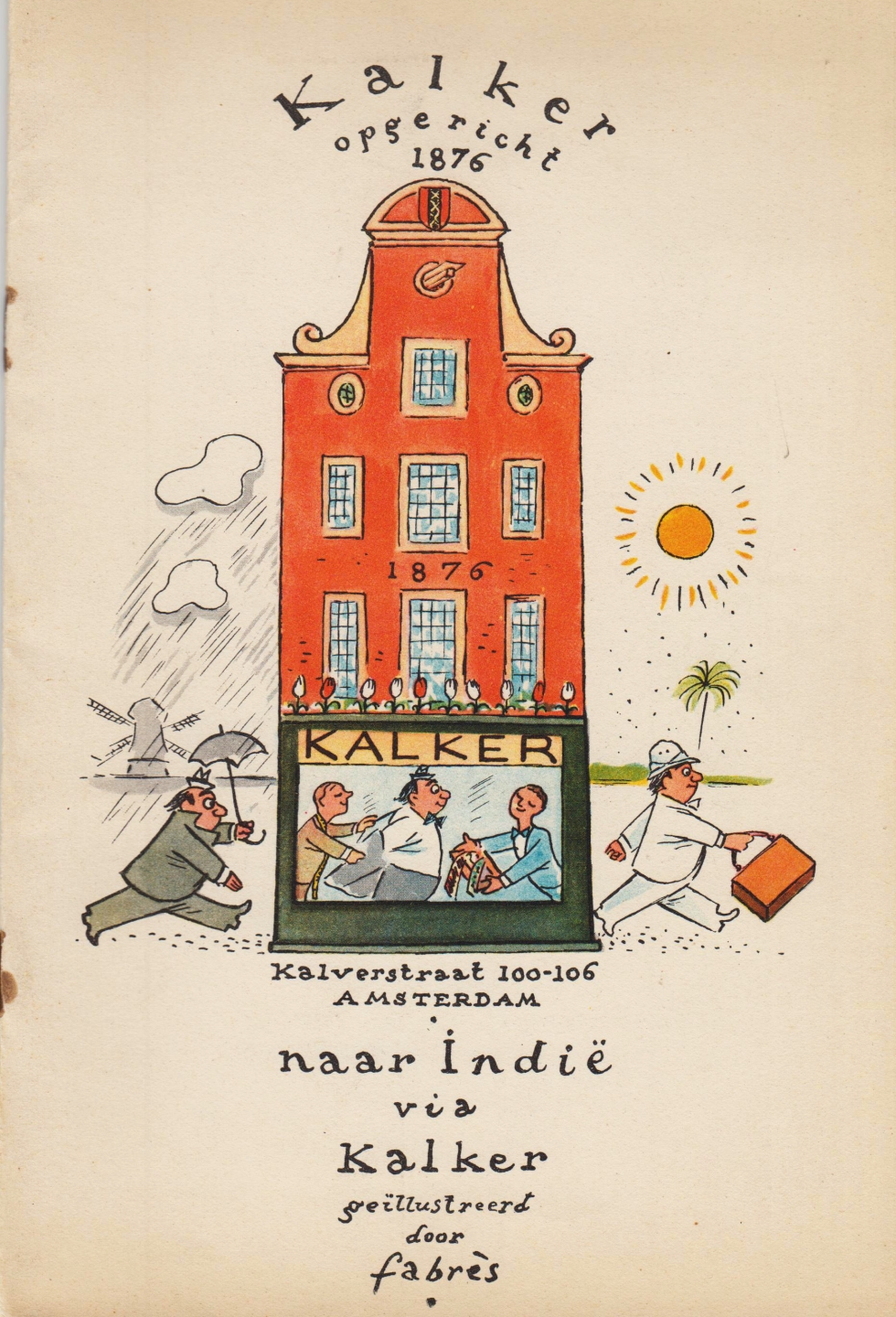 13. FABRÈS, Oscar Naar Indië via Kalker. Geïllustreerd door Fabrès. [Amsterdam], Kalker, [1938]. Geniet. 20 p. incl. omslag Met 17 tekeningen in kleuren en drie pagina’s prijslijst naar het handschrift van Oscar Fabrès. Wat nietjesroest, verder goed.