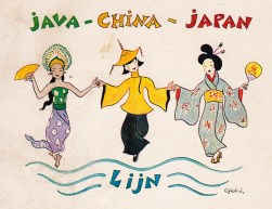 10. FABRÈS, Oscar Java-China-Japan Lijn. Sketches by O. Fabrès. [Amsterdam], Java-China-Japan Lijn, 1934. Geniet. 20 p. Met 13 tekeningen in kleuren van Oscar Fabrès. Teksten in het Frans en het Engels. Wit omslag wat grauw.