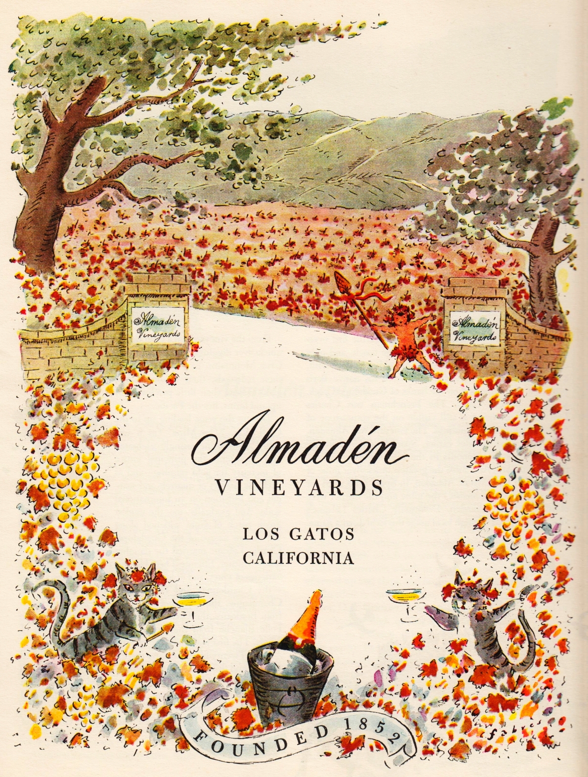 4. FABRÈS, Oscar Almadén Vineyards. Los Gatos, CA, Almadén Vineyards, 1948. 30 x 23 cm. Geniet. 8 p. incl. omslag. Met 20 kleurenillustraties van Oscar Fabrès. Keurige conditie.