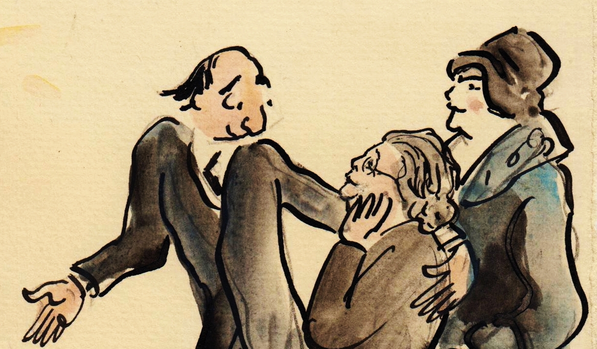 * Fabrès en zijn vrouw laten de blij verraste ‘Oma’ een mantelpak zien met etiket ‘Pach/ Texstraat/ 29’. Gekleurd in roze, groen, geel en grijs, en met deels zichtbare ondertekening in potlood. Christina Overduin-Kaan (1862-1950), de moeder van Oscars echtgenote Alice Overduin, vierde die dag haar 69e verjaardag. Op Den Texstraat 29 was de kleermakerij van Eliazer Pach gevestigd, die in 1942 in Auschwitz werd vermoord. (Bovenaan deze nieuwsbrief ziet u Oscar, Oma en Alice uit deze tekening)
