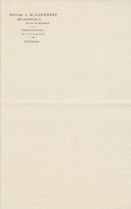 11. SLAUERHOFF, J. Origineel briefpapier met gedrukt briefhoofd. 21,5 x 13,7 cm. Eén blad. Eenmaal (licht) gevouwen. Met gedrukt briefhoofd: ‘Docteur J. SLAUERHOFF/ Rue Garibaldi, 6/ (Place du Marshan)/ consultations:/ de 11 à 12 et de 3 à 5/ téléphone:’. Watermerk ‘Imperial Japan Paper Galas’. Onbeschreven.